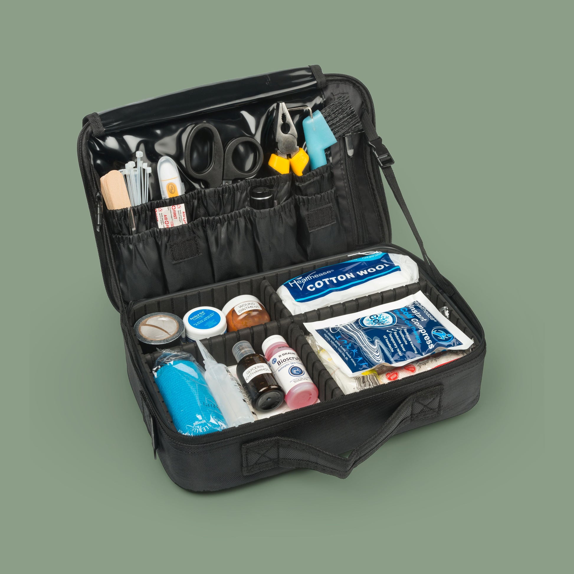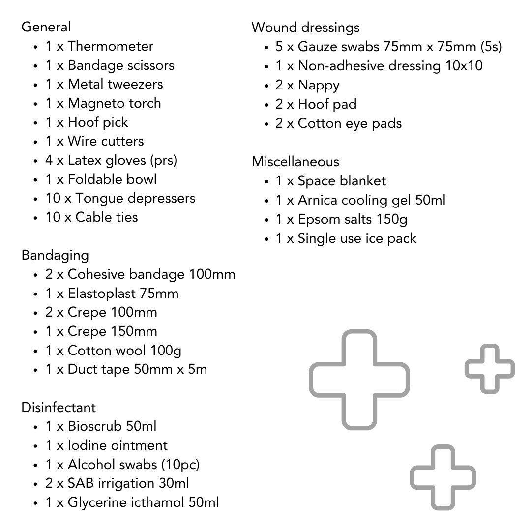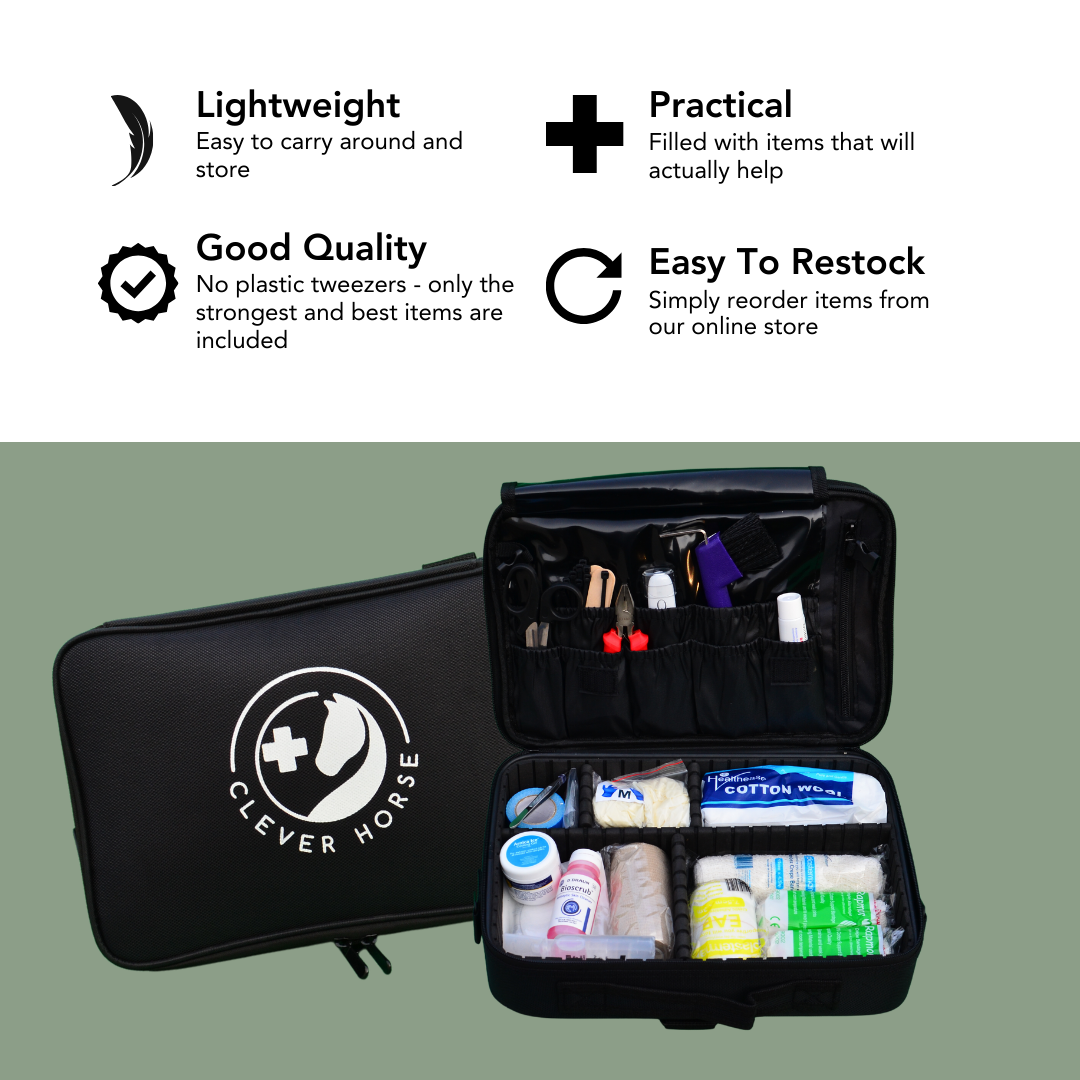The Crisis Kit is our deluxe first aid kit. Packed into a larger bag, this kit is still convenient and lightweight and suitable for storing in your tack room or locker. The Deluxe Kit offers almost double what the standard kit offers and includes some additional tools like a torch and an ice pack.